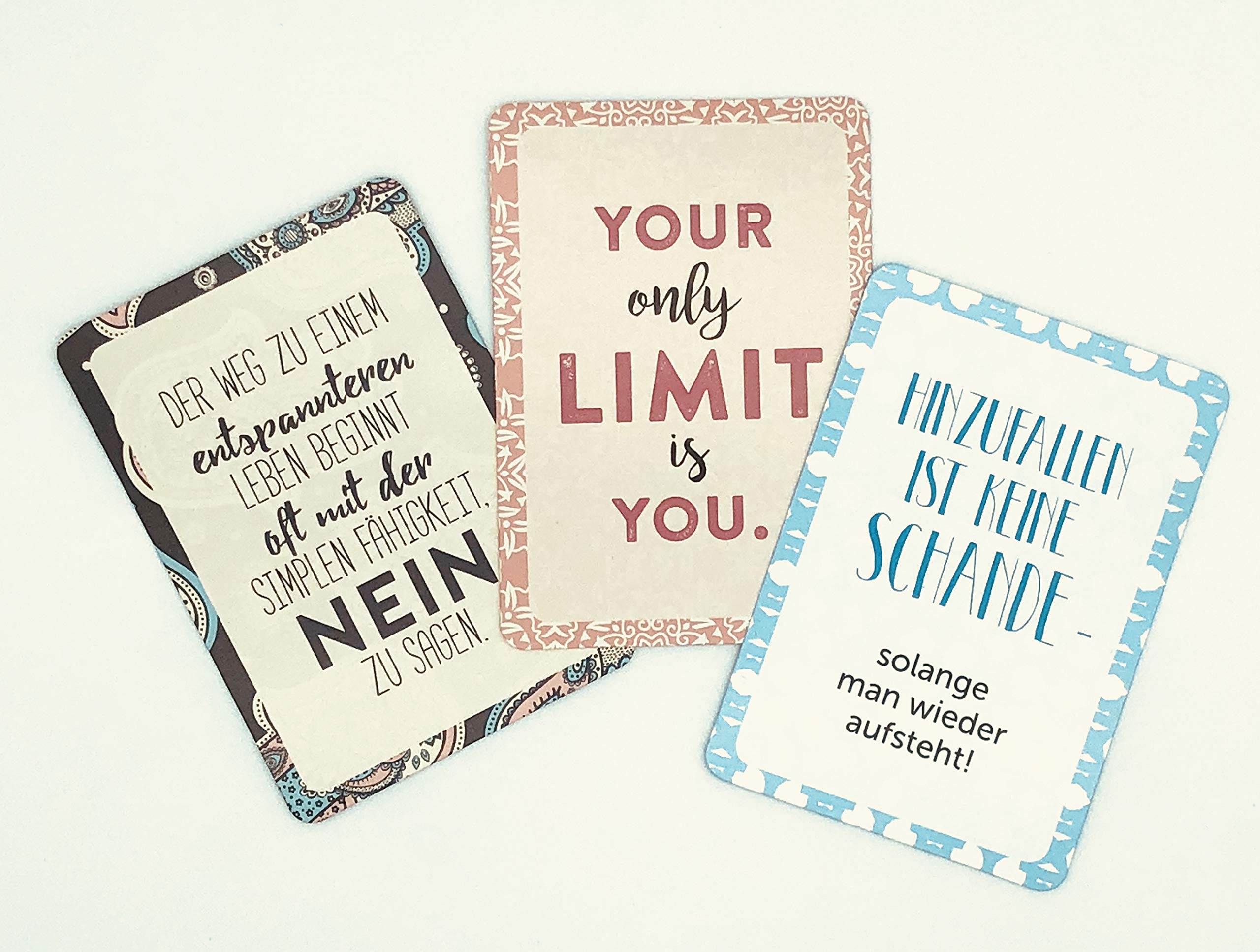 Familie, Job, Partnerschaft – alle möglichen Lebensbereiche halten gleichzeitig eine Unmenge an Pflichten und Druck für uns bereit. Um alles unter einen Hut zu kriegen, hetzt man oft durch den Tag und ist am Ende einfach nur gestresst. Dieses Kartenspiel schafft Gelegenheiten, um einen Moment innezuhalten und mehr auf die innere Stimme zu hören. Die Karten bieten inspirierende Sprüche und anregende Tagesaufgaben, die nachdenklich machen und einem den Weg zeigen, bewusster und achtsamer zu leben. Egal ob als tägliches Ritual oder spontane Gedankenübung – durch das handliche Format sind die ästhetischen Karten immer dabei und helfen auch unterwegs, zu Gelassenheit und innerer Ruhe zu finden.