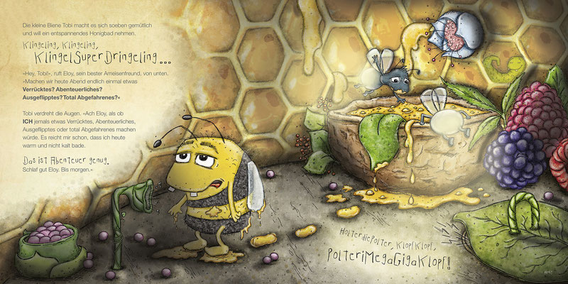 Tobi ist die ängstlichste Biene der Welt und möchte sein sicheres Bienenzuhause nie, nie, nie verlassen. Als jedoch sein allerbester Ameisenfreund Eloy von einem Ausflug nicht zurückkommt, macht sich Tobi große Sorgen. Die Angst, dass er seinen Freund nie mehr wiedersieht, ist größer als die Angst, nach draußen zu gehen, um nach Eloy zu suchen. Überwältigt von den vielen SeltsamKomischDingen und Düften im Wald, gewinnt er mit jedem Flügelschlag nicht nur Mut, sondern auch neue Freunde dazu.