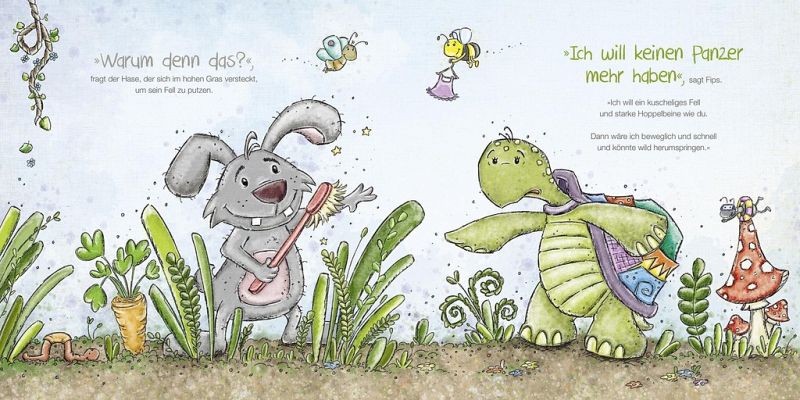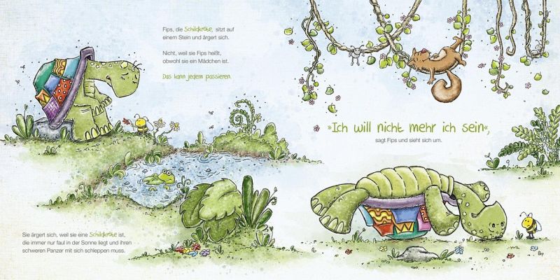 Fips ärgert sich. Nicht, weil sie Fips heisst, obwohl sie ein Mädchen ist. Das kann jedem passieren. Sie ärgert sich, weil sie eine Schildkröte ist, die immer nur faul in der Sonne liegt und ihren schweren Panzer mit sich schleppen muss. Viel lieber möchte sie umherhüpfen wie ein kuscheliger Hase, flink sein wie ein Fuchs oder wie ein Vogel durch die Lüfte schweben.