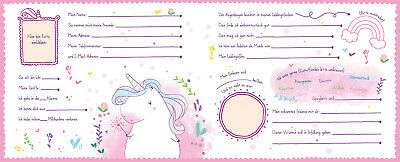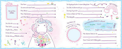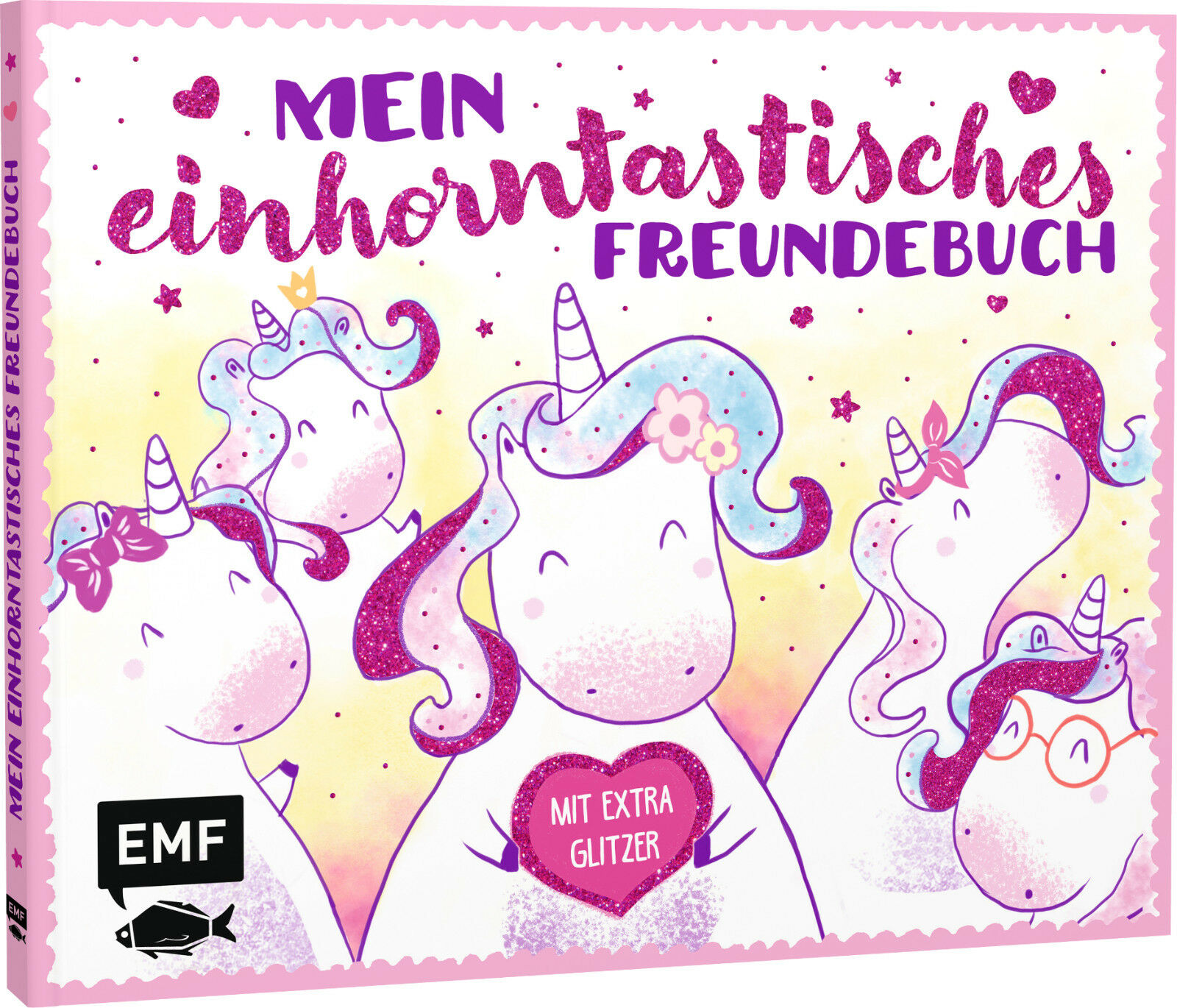 Einhörner überall - der Trend ist ungebrochen! Und da Freundschaften sowieso etwas Magisches haben, werden sich alle kleinen und großen Einhorn-Fans, ihre Freunde und Schulkameraden in diesem charmanten Freundealbum verewigen wollen! Natürlich finden sich hier 23 wunderschön gestaltete Seiten mit viel Platz für lustige Fotos und süße Einträge wie "Das finde ich einhorntastisch gut", "Dieser Wunsch soll in Erfüllung gehen" oder "Ich esse gerne Kaugummi, Sternenstaub, Eiscreme, Spaghetti, Glitzer ... (Zutreffendes bitte umkreisen)". Es gilt aber auch, einen Regenbogen in den Lieblingsfarben auszumalen oder sich mit einem Einhorn-Bild im Zauberwald zu verewigen. Außerdem können sich alle Freunde in einen Geburtstagskalender eintragen und auf einer Seite gute Wünsche für den Besitzer des Albums hinterlassen. Und das wattierte Cover mit extra viel Glitzer macht dieses Freundesalbum zum echten Hingucker!