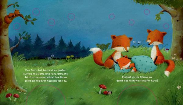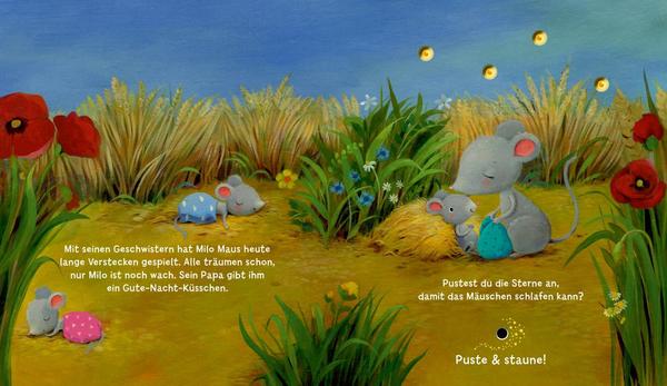 Einmal pusten und es leuchtet! Mitmach-Buch für die Allerkleinsten!Dieses Pappebuch für Kinder ab 18 Monaten begeistert durch seinen magischen Mitmach-Effekt: Einmal pusten und die Lichter beginnen zu leuchten!So können schon die Allerkleinsten den müden kleinen Tieren beim Einschlafen helfen. Denn Emma Ente, Fine Fuchs und Benni Bär können einfach nicht einschlafen.Jetzt einmal pusten und schon beginnen die Sterne am Himmel zu leuchten.So können die Tierkinder beruhigt die Äuglein schließen.Ein zauberhaftes Gute-Nacht-Buch mit Puste-Licht! Die im Buch integrierten LED-Lämpchen werden durch den Luftstrom beim Pusten aktiviert und beginnen wie durch Zauberhand zu leuchten! Um die Batterie zu schonen, wird nach 2 Minuten Inaktivität automatisch ein Sleep-Modus aktiviert. Durch erneuetes Einschalten ist das Buch für eine neue Puste-Runde einsatzbereit!