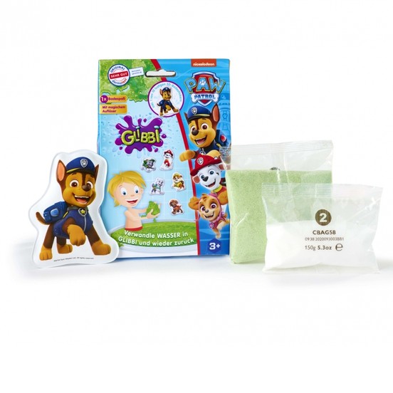 Ab sofort könnt ihr mit Ryder, Marshall, Chase und den anderen Paw Patrol Mitgliedern jede Menge Badespass erleben. Einfach das Glibbi Pulver in das Badewasser schütten und dabei zusehen wie sich dieses in eine glibbrige grüne Masse verwandelt.