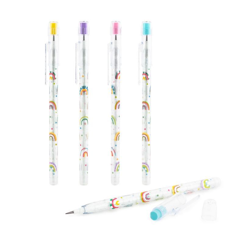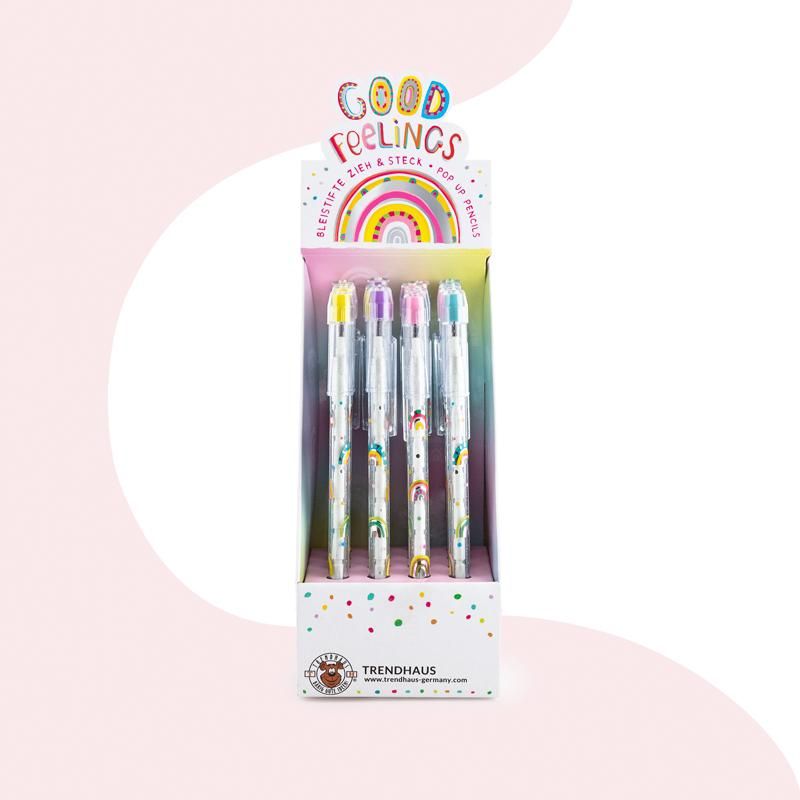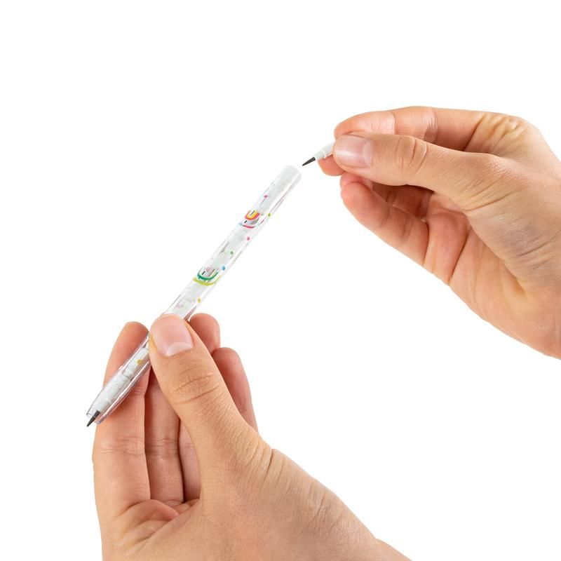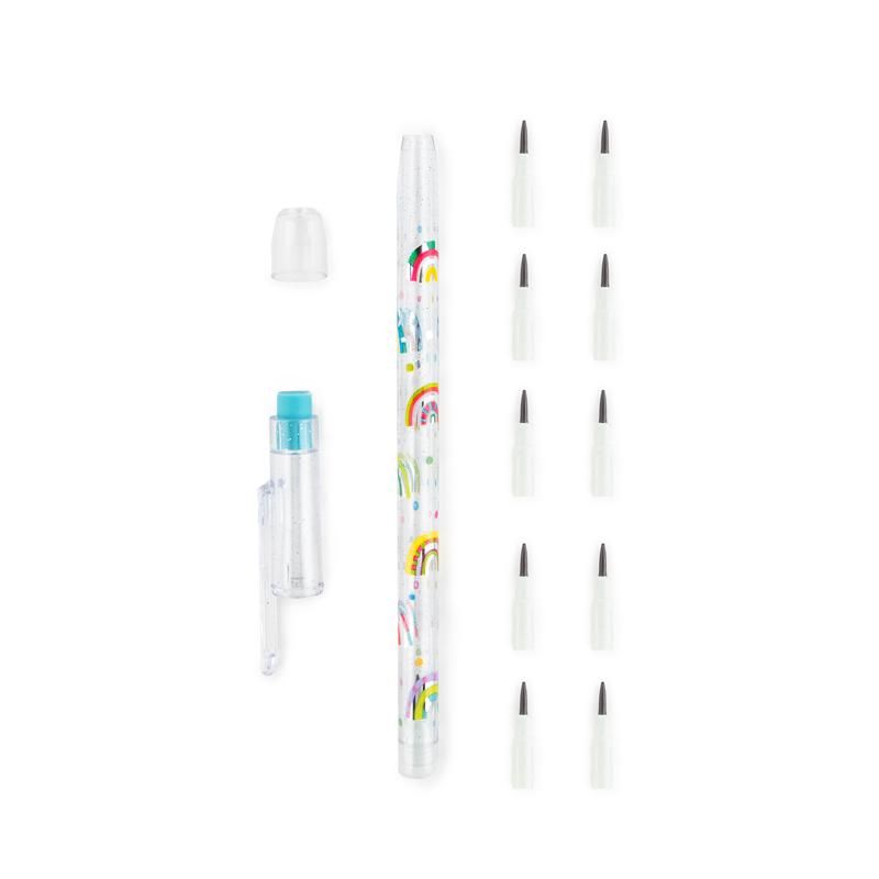 Dieser transparente Zieh- und Steck-Bleistift mit 10 einzelnen Steckbleistiften fällt auf mit seinem bunten Regenbogen-Allover und der coolen Glitzer-Kappe inkl. praktischem Radierer.