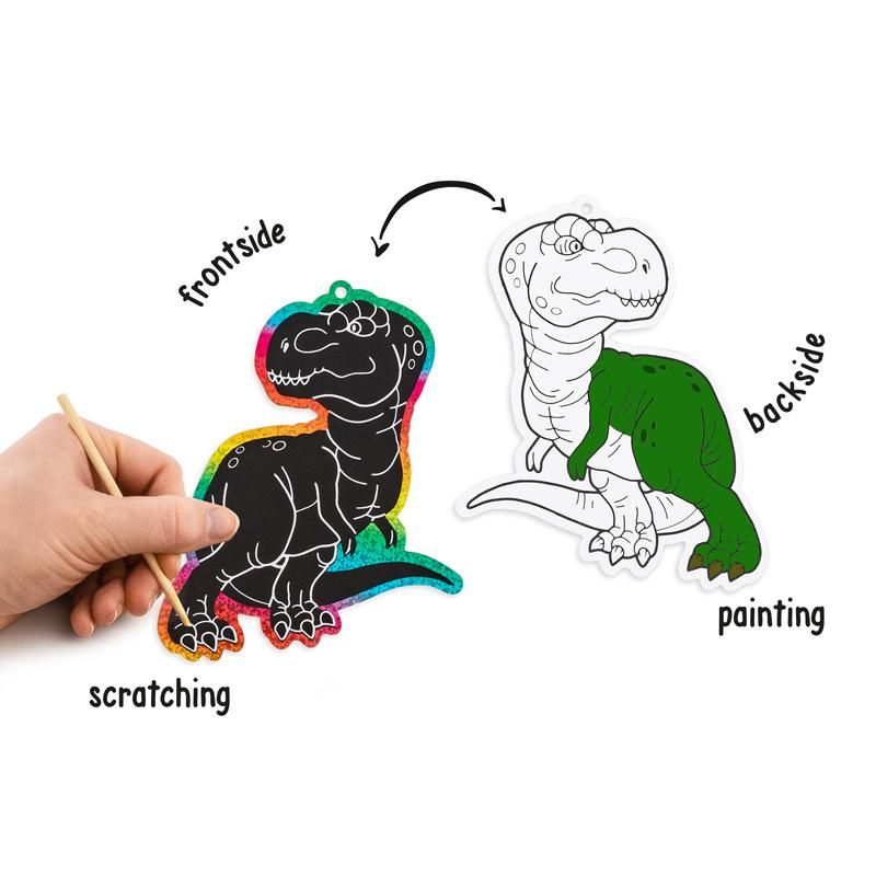 Set-Inhalt: 6 Dinovorlagen zum Auskratzen & Ausmalen, 6 bunte Bänder zum Aufhängen und 1 Holz-Kratzstift.