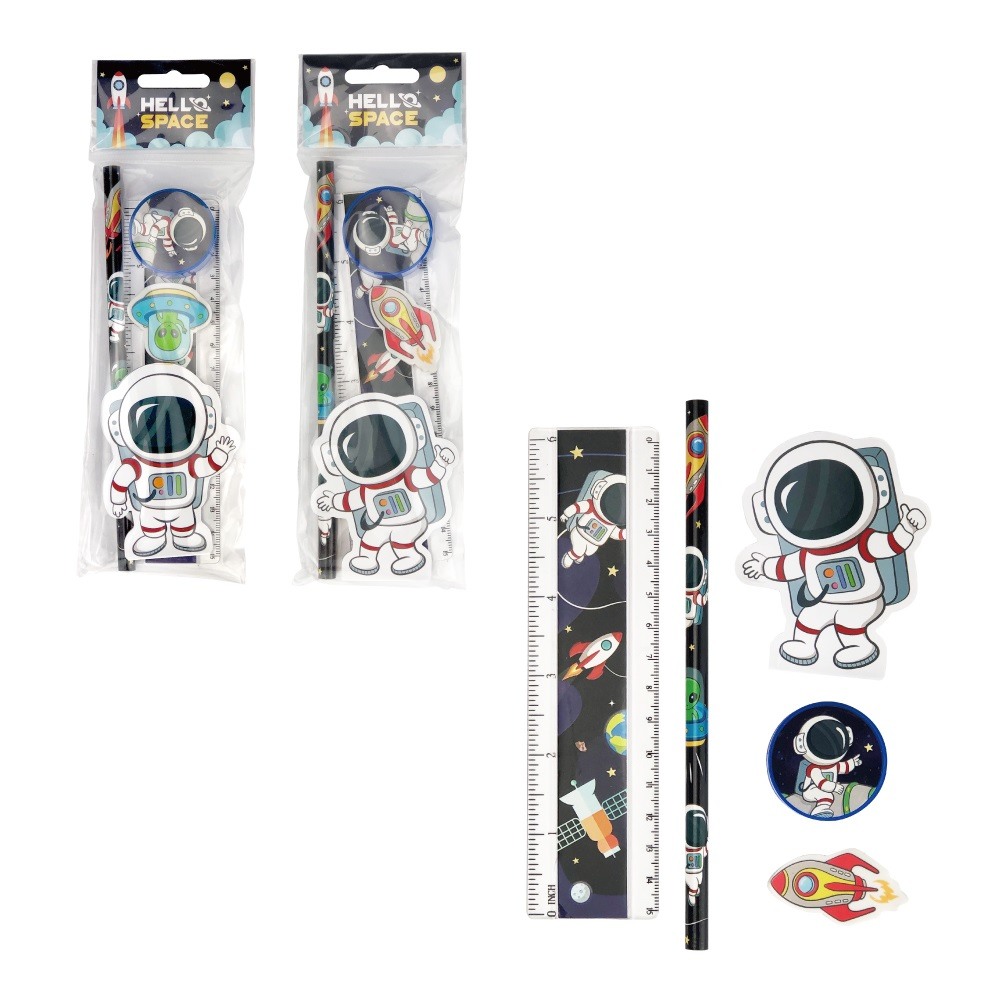 Set inkl. 1 Spitzer, 1 Radierer, 1 Lineal, 1 Bleistift und 1 Block in Form eines Astronauten