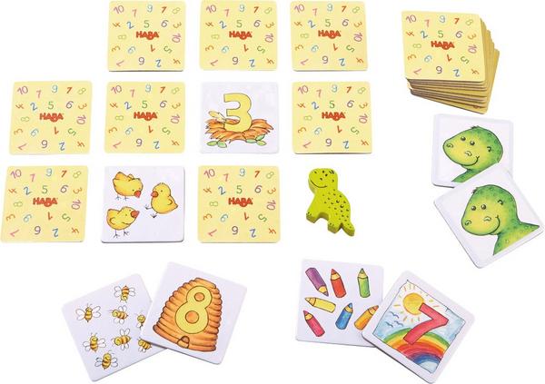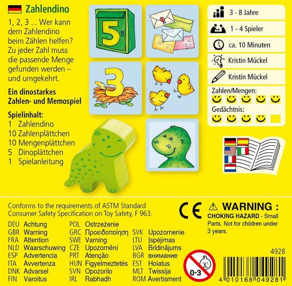 1, 2, 3 ... Wer kann dem Zahlendino beim Zählen helfen? Mit diesem dinostarken Zahlen- und Memospiel können bis zu vier Kinder von drei bis acht Jahren spielerisch den Zahlenraum von 1 bis 10 entdecken. Zu jeder Karte mit einer Ziffer muss die Karte mit der passenden Menge gefunden werden. Sie lernen so nicht nur das Lesen von Zahlen, sondern auch das Erkennen von Mengen. Die Bilder auf den Karten helfen dabei: Die Symbole auf den Zahlen- und Mengenkarten gehören immer zusammen. Und außerdem gibt es noch den lustigen Zahlendino. Wer den am Schluss hat, dem hilft er beim Gewinnen.