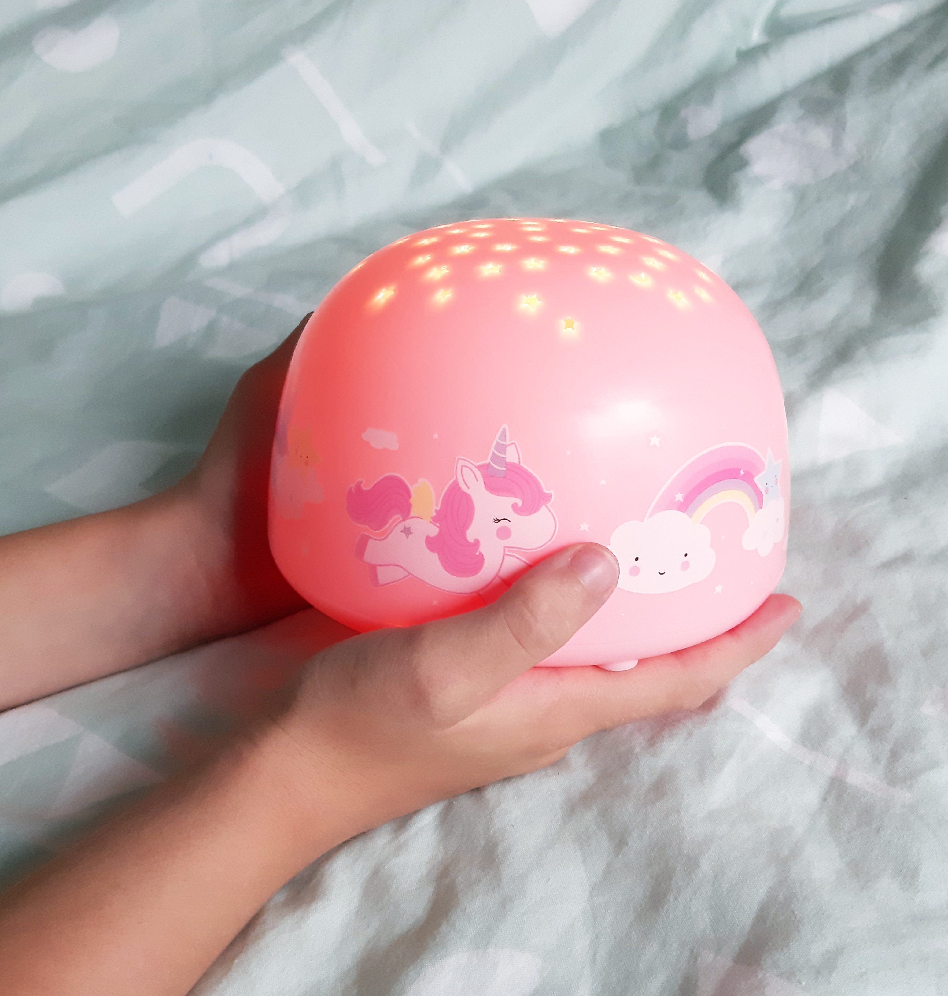 Diese einzigartige Lampe mit süssen Motiven projektiert Sterne auf die Decke deines Baby- oder Kinderzimmers. Mit dem Schalter wechselst du ganz einfach zwischen verschieden farbigen Sternen: Regenbogenfarben, orange, grün oder blau. Dank der praktischen Timerfunktion schaltet sich die Projektorlampe nach 30 Minuten automatisch aus. So kann dein Sprössling unter einem lovely Sternenhimmel einschlafen!