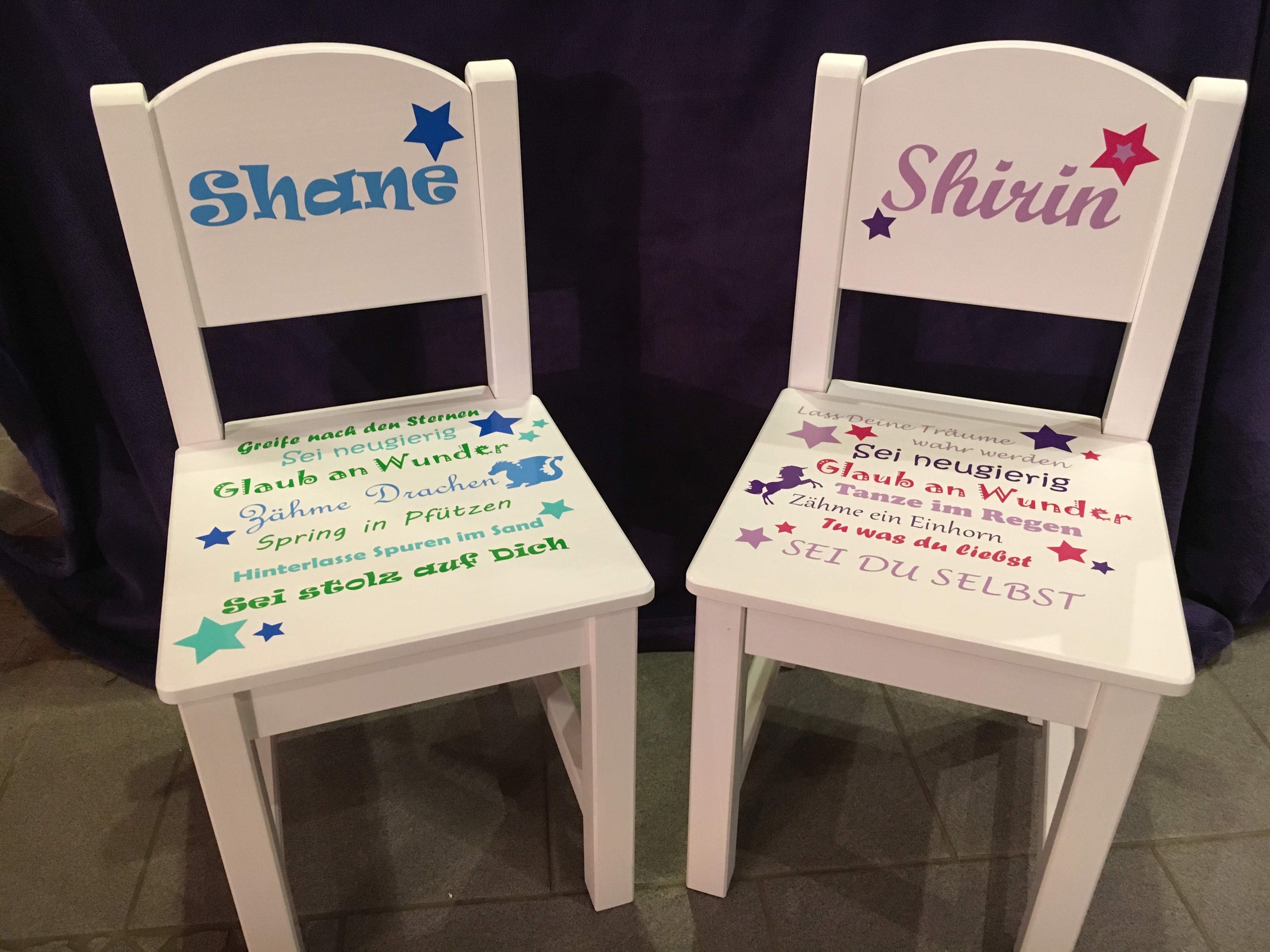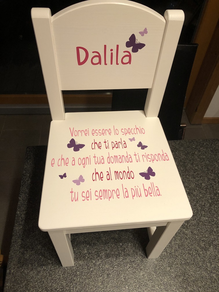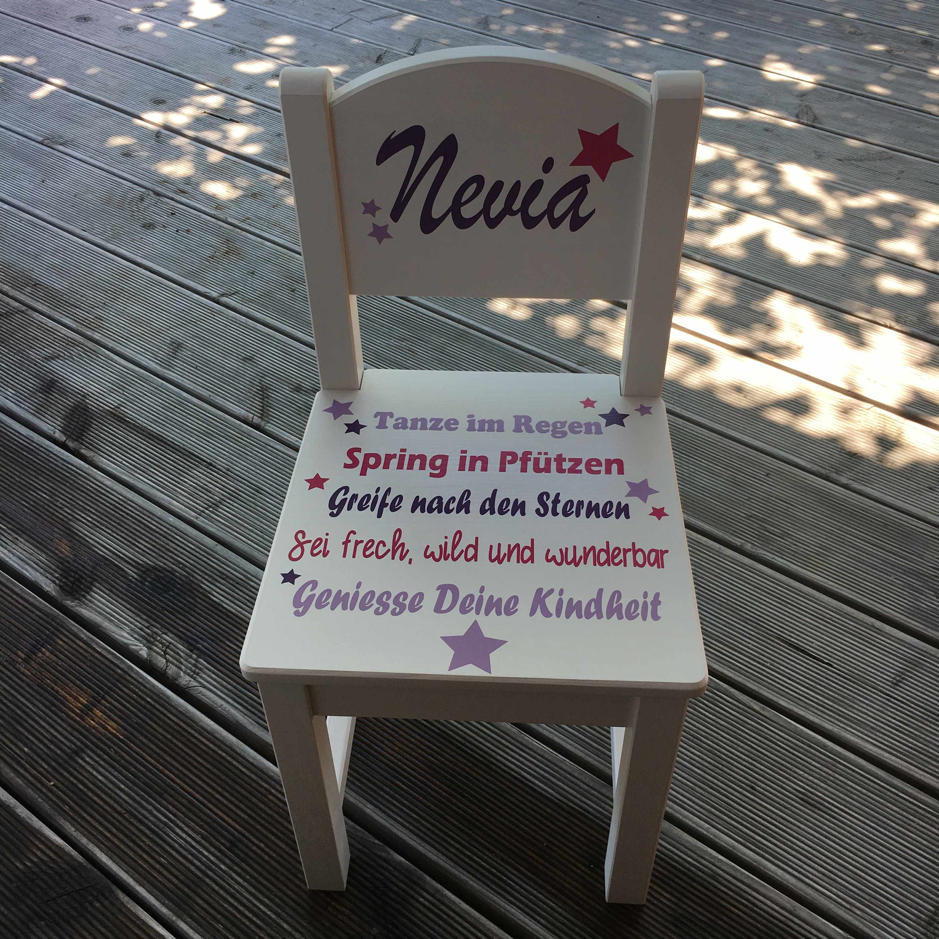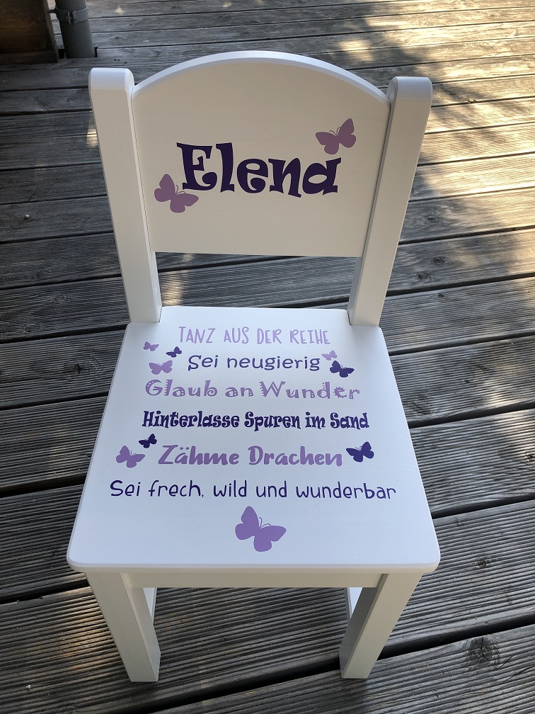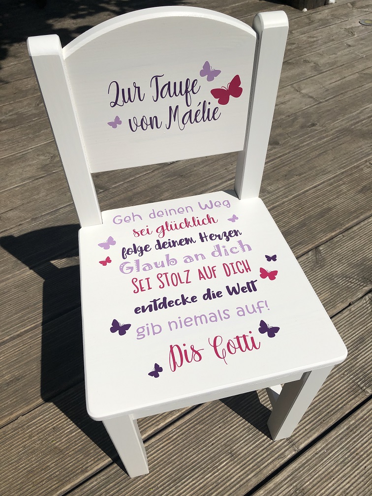 Dieser Kinderstuhl kann individuell gestalltet werden mit Name, Sprüchen und Sujets