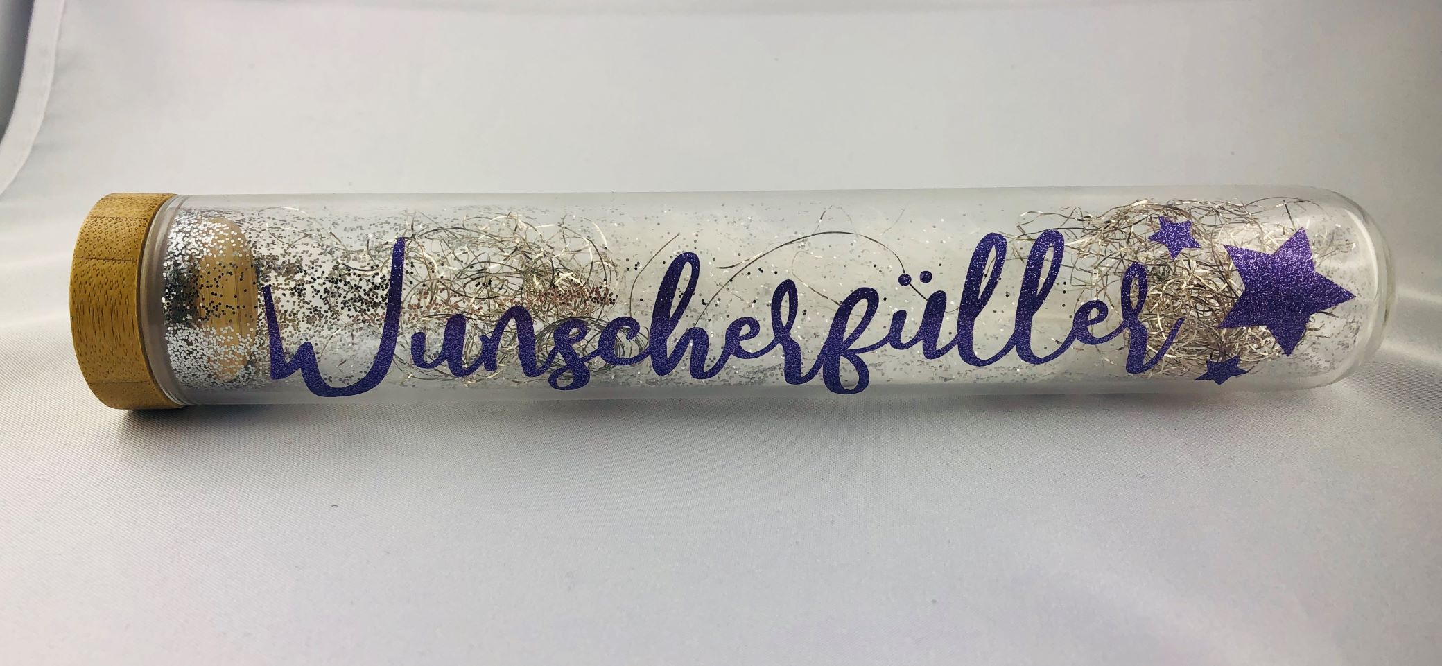 Grosses Reagenzglas, welches mit Wunschtext beschriftet und wahlweise befüllt werden kann mit Glitzer, Pailletten,Federn und Lametta