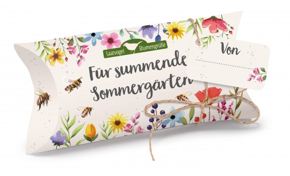 Papp-Box (15,5 x 7 cm), mit Geschenkanhänger und Naturkordel-Schleife gefüllt mit 3 Saatkugeln mit Wildblumensamen, 15,5 x 7 cm