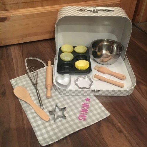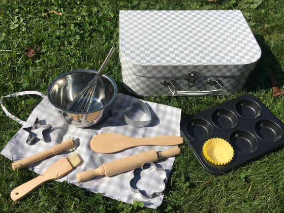 12-teiliges Backset für kleine Bäcker in trendigem Köfferchen verpackt. Da leuchten die Augen der Schleckmäuler