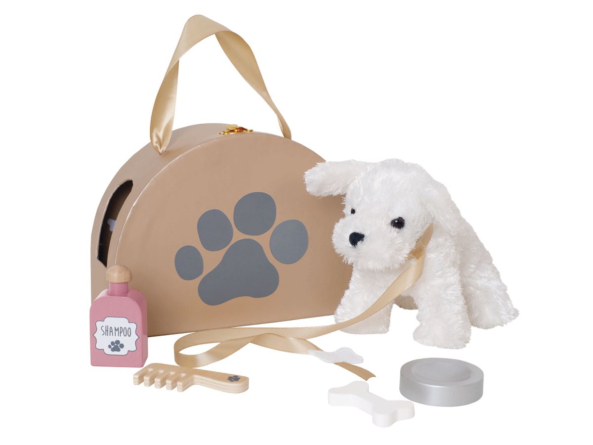 Mit diesem kleinen flauschigen Welpen kommt viel Freude ins Haus. Der Hund kommt in seinem eigenen Haus und hat eine kleine Leine sodass er einfach ausgeführt werden kann. Wenn der Hund sich im Schlamm gewälzt hat kann man ihn mit dem dazugehörigen Shampoo waschen und das Fell kämmen.