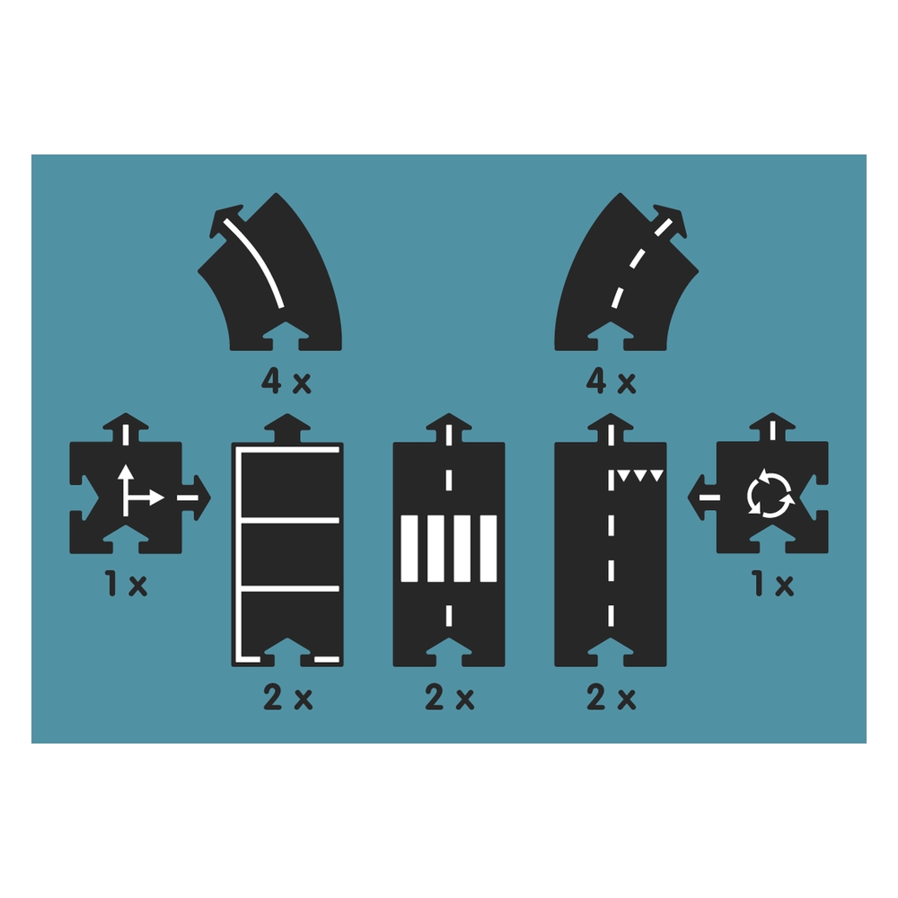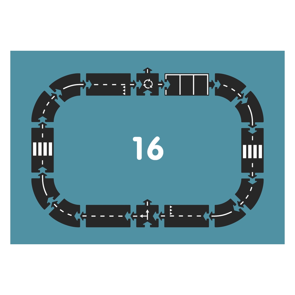 Beinhaltet 8 Kurven, 6 Geraden, 1 Kreuzung und 1 Kreisverkehr.