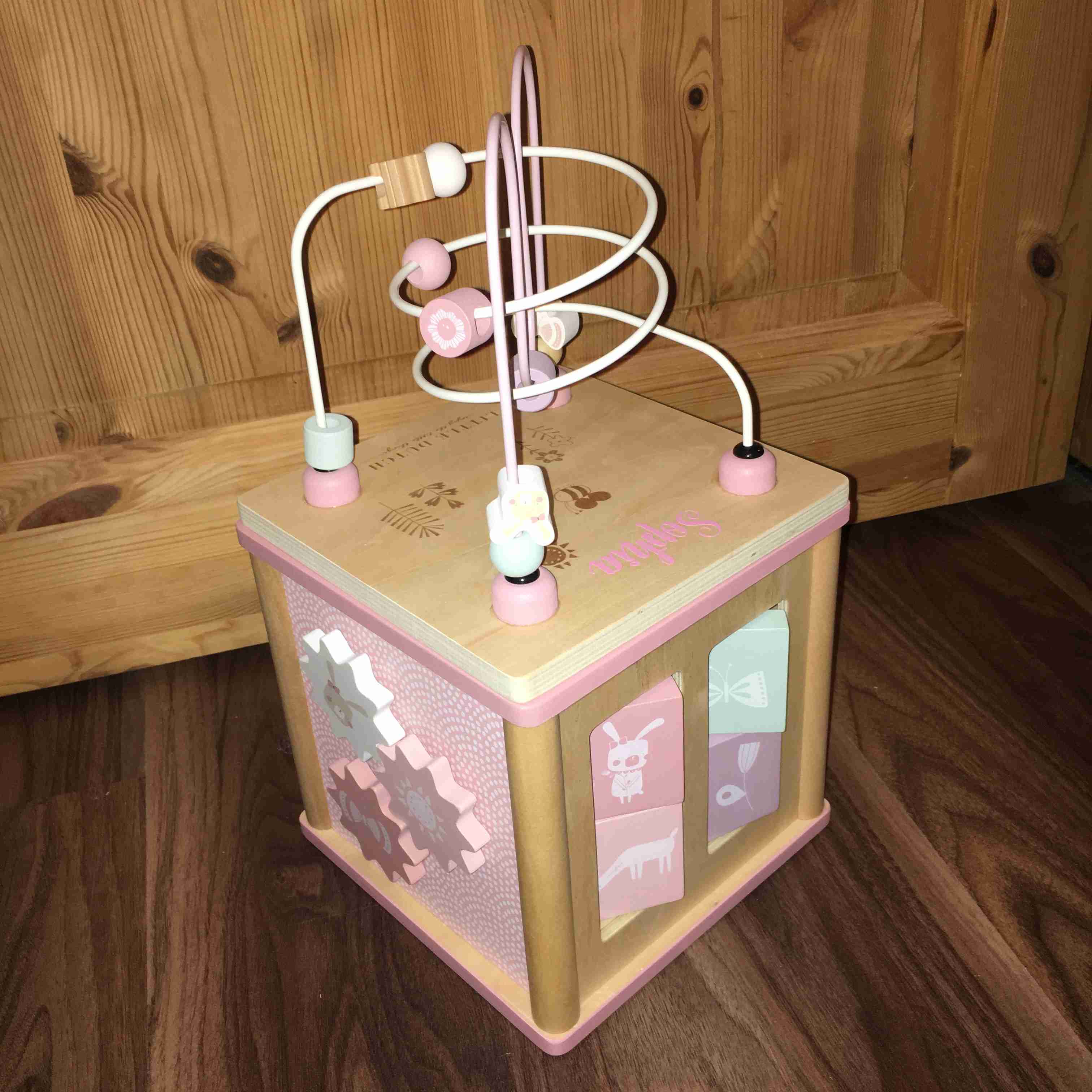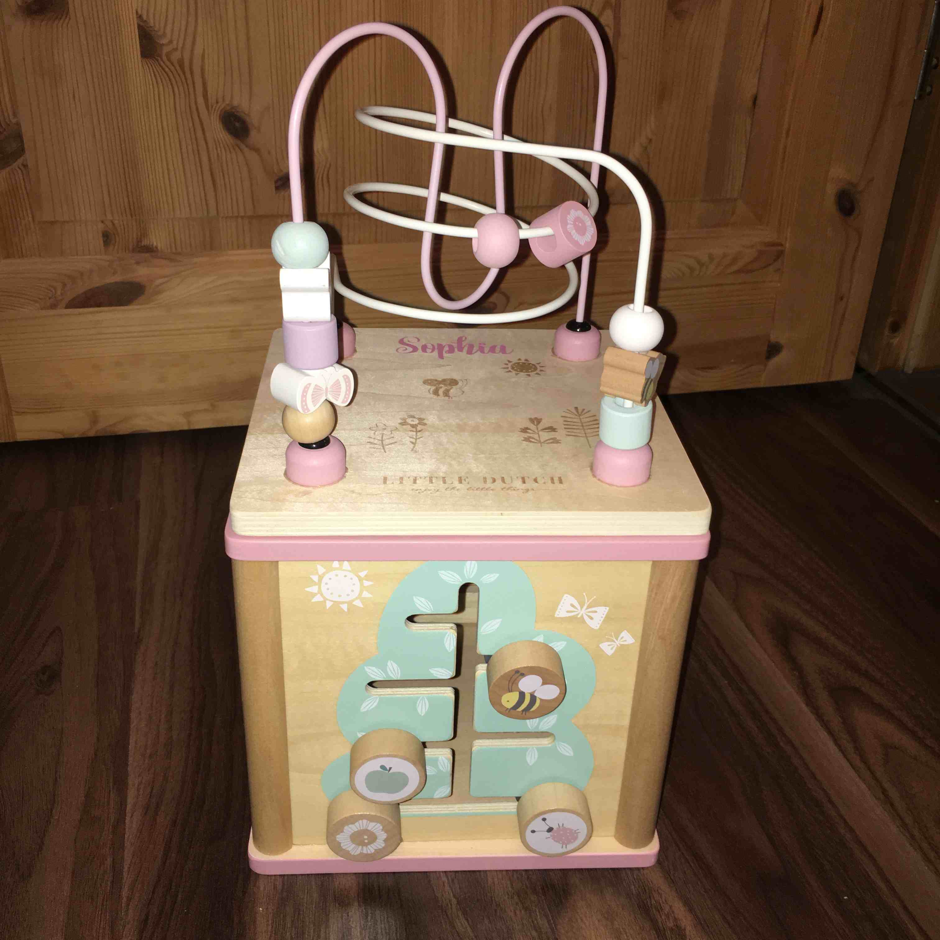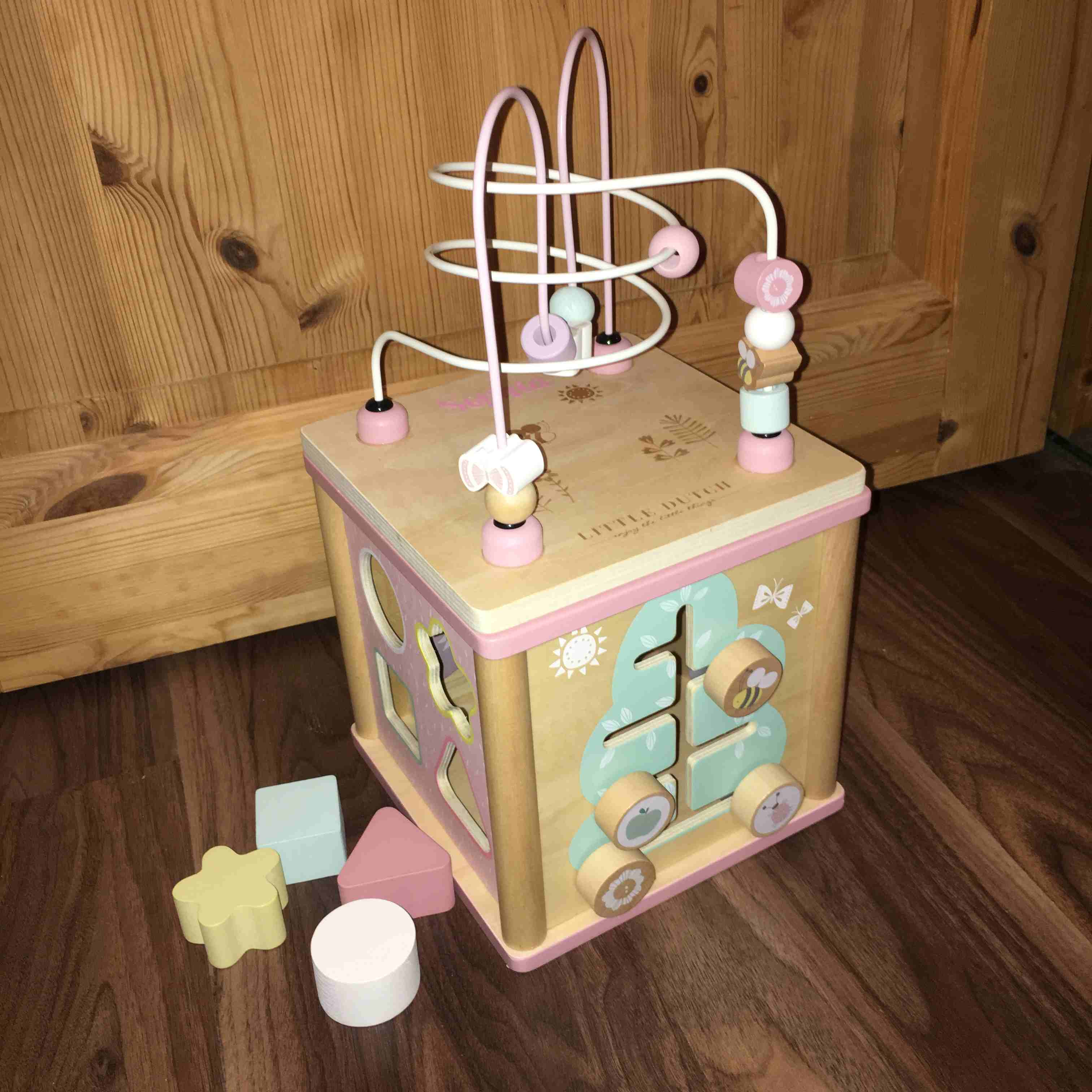 Der Aktivitäten-Würfel von Little Dutch sorgt für zahlreiche Herausforderungen für Ihr Kind. Jede Seite bietet eine andere Lernaktivität. So gibt es ein Formen-Steckspiel, ein Zahnradspiel und oben eine schöne Motorikschleife. Da die Motorikschleife nach Gebrauch in den Würfel gelegt werden kann, ist sie auch einfach zu lagern. Ihr Kind wird viel Spaß mit dem Aktivitäten-Würfel haben.