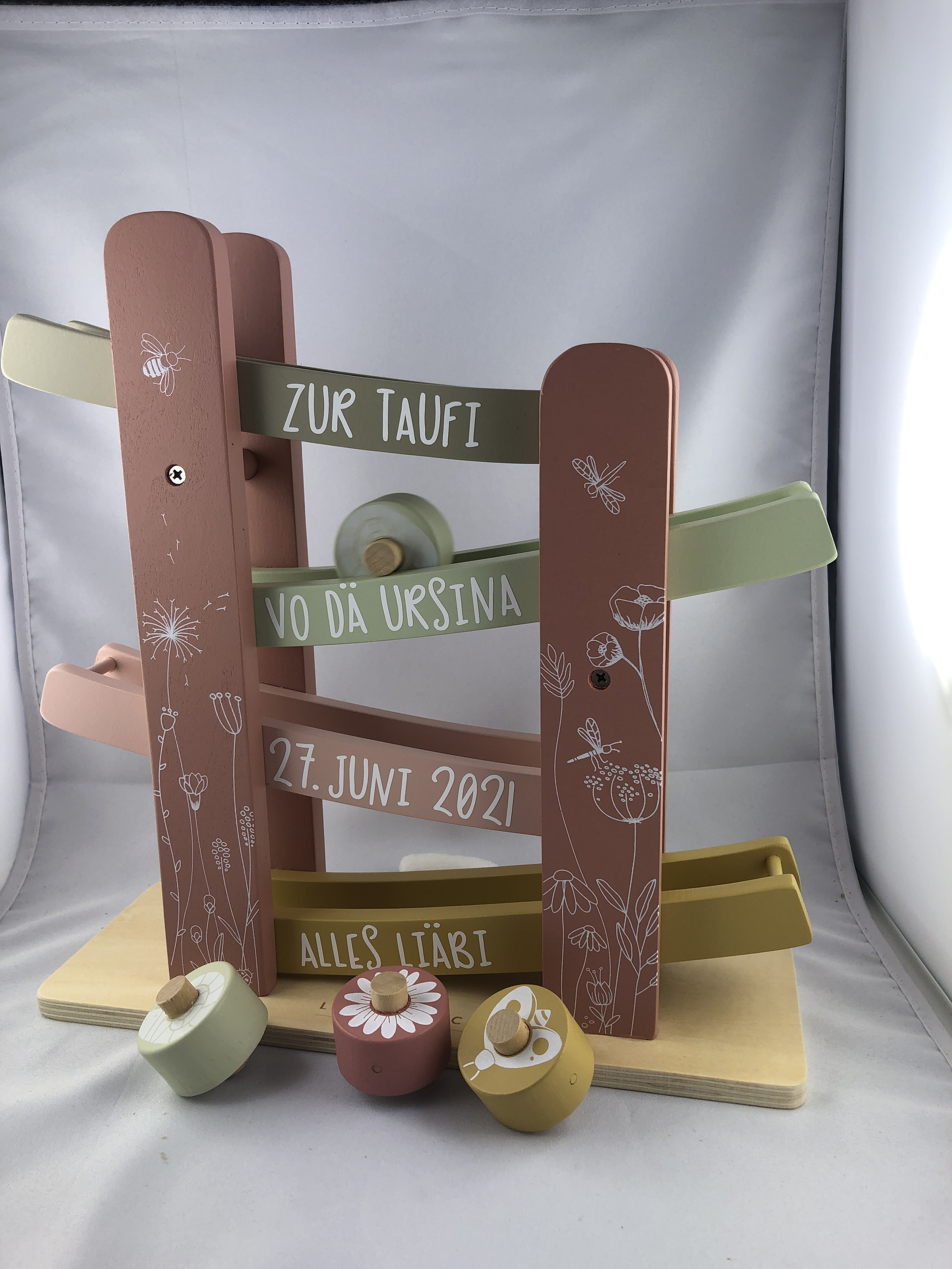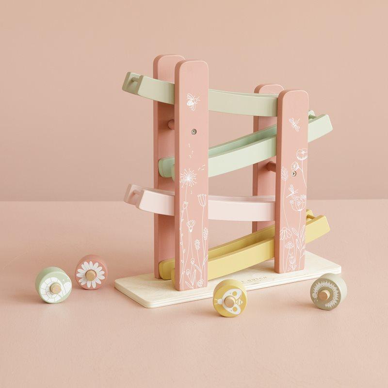 Auf die Plätze, fertig, los! An dieser fröhlichen Holzrennbahn mit vier runden Blumen hat Ihr Kind sicher viel Spaß. Einfach jeweils eine Rondelle oben an den Anfang der Bahn stellen, loslassen und zusehen, wie es in rasendem Tempo nach unten fährt.